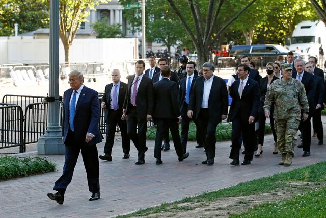 به باور سی ان ان ویژگی رایج خیلی از حرکات نمایشی ترامپ آزار دهنده بودن آنها بوده است مثل زمانی که او در دور اول ریاست جمهوری خود اقدام به راهپمایی به سمت میدان لافایت واشنگتن کرد بعد از آنکه نیروهای امنیتی آمریکا با خشونت معترضان به او را از مسیر این راهپیمایی پاکسازی کردند. دستیاران ارشدی شامل مارک میلی رئیس سابق ستاد مشترک ارتش آمریکا نیز در این رویداد نمایشی او را همراهی کردند و بعدا میلی به خاطر شرکت در کنار ترامپ مقابل دوربین های عکاسان عذرخواهی کرد و تبدیل به یکی از دشمنان سیاسی ترامپ شد.